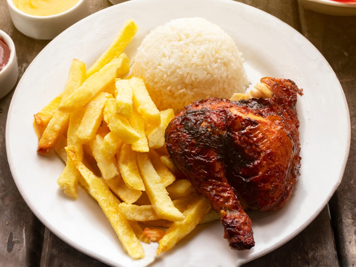 The menu is centered on Peruvian-style rotisserie chicken, often called pollo a la brasa, a dish that traces its roots back to Lima in the 1950s. According to culinary historians from Peru’s Ministry of Culture, the cooking method became popular because it evenly roasts the bird while locking in moisture, something you can clearly taste here. The chicken is marinated for hours using a blend of garlic, cumin, paprika, and citrus, then rotated slowly over controlled heat. Research from the USDA shows that rotisserie cooking, when done properly at safe internal temperatures, helps reduce excess fat while keeping protein content high, which explains why the meat here feels both indulgent and surprisingly light.